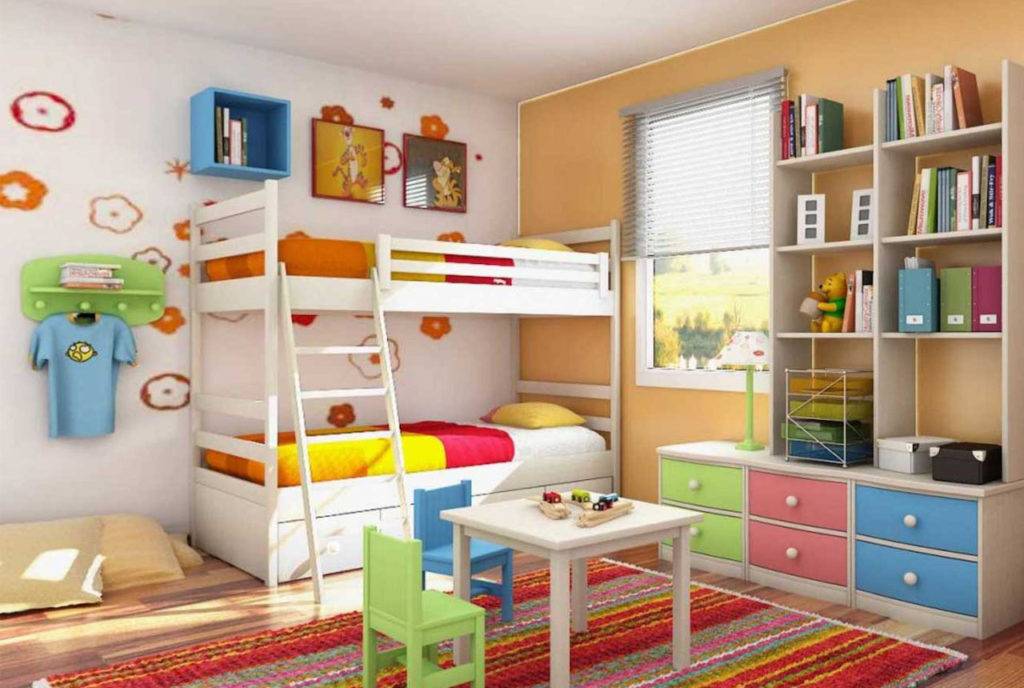 Комната для двоих однополых детей оформляется в одной оттеночной гамме, которая приходится по вкусу обоим хозяевам спальни. Оптимальной планировкой является расположение двухъярусной кровати возле одной стенки, обустройство рабочего места и систем хранения вдоль противоположной или смежной стены. В детской также можно снизить уровень подоконника, расширить его и превратить в небольшой диванчик для чтения или игр.