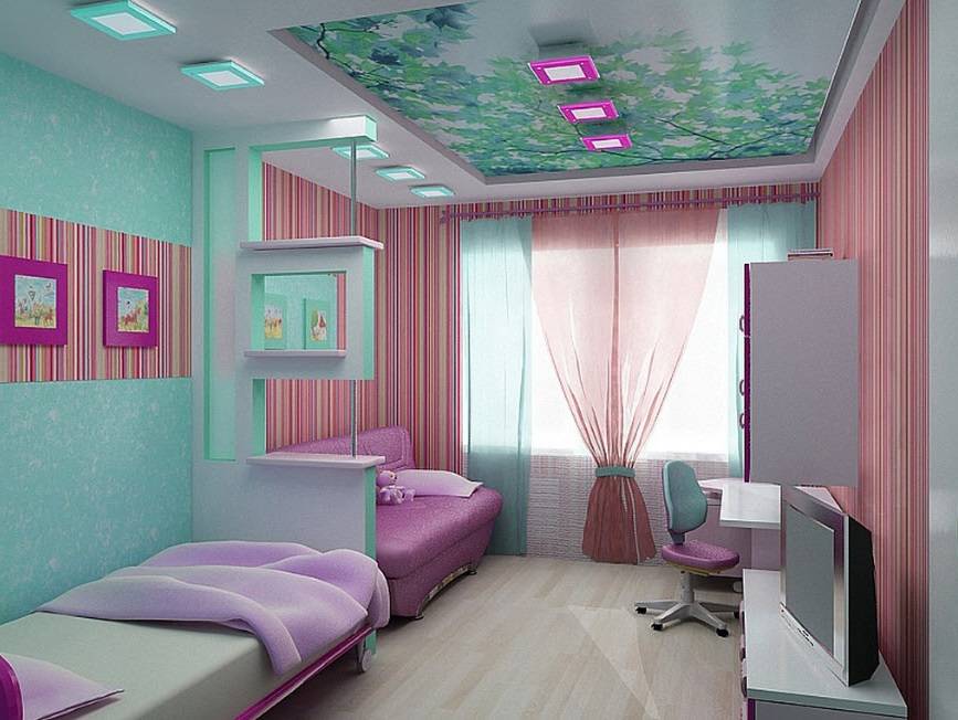 Если комната небольшая, можно сделать двухъярусную кровать, стеновое пространство возле которой будет декорировано по вкусу каждого, но с элементами общей стилистики комнаты. Требования компактности для мебели и индивидуальных зон немаловажны. Спальные зоны – это то, что занимает самую большую площадь в помещении. О способах визуального увеличения пространства можно позаботиться, но не следует снабжать комнату небезопасными стеклянными зеркалами. Лучше использовать такие приемы, как грамотное размещение светильников, вертикальные полосы и ниши с фотообоями.