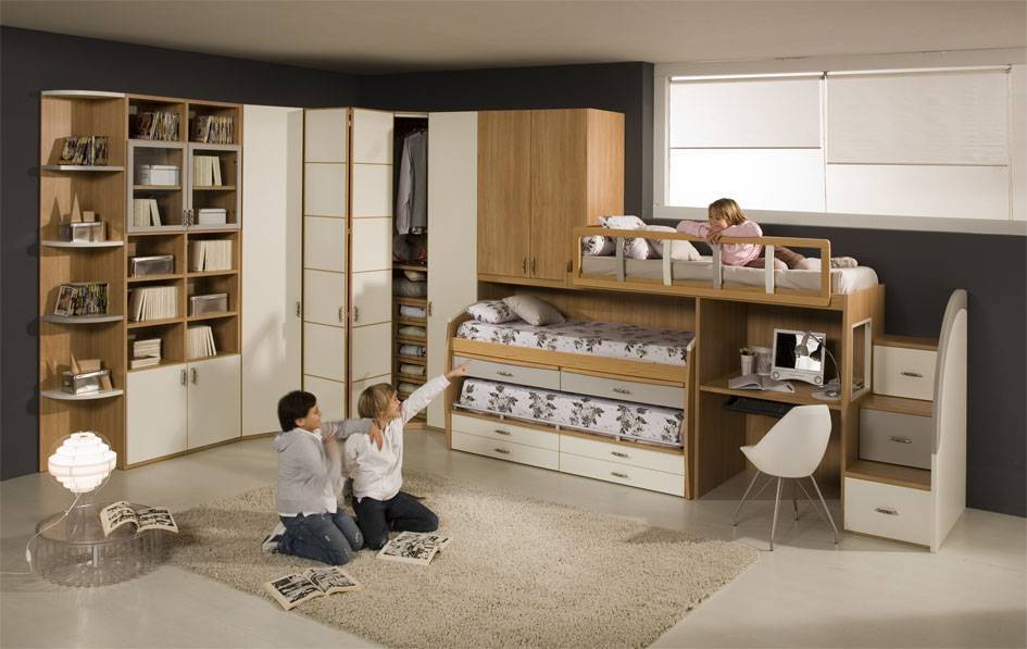 Если дети между собой хорошо ладят, то для них можно обустроить один просторный шкаф-купе, разделенный на секции. Каждому ребенку в этом случае выделяется половина шкафа, сооружаются полки и штанги для одежды. Дизайнеры рекомендуют присмотреться к угловым моделям шкафов, которые экономят пространство.