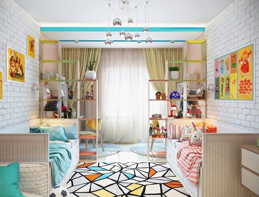 Если комнату делит мальчик и девочка, можно пространство делить перегородкой и каждую половинку оформлять по-своему, но с одинаковым набором мебели. Когда пространство маленькое, разграничение пространства производится цветом.