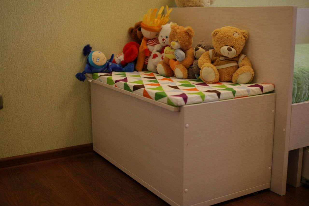 Ящики под кроваткой или шкафом. Это тоже весьма удобный вариант хранения игрушек. Если нет специального встроенного ящика, можно купить большой кофр на молнии и убирать его вместе с игрушками под мебель.