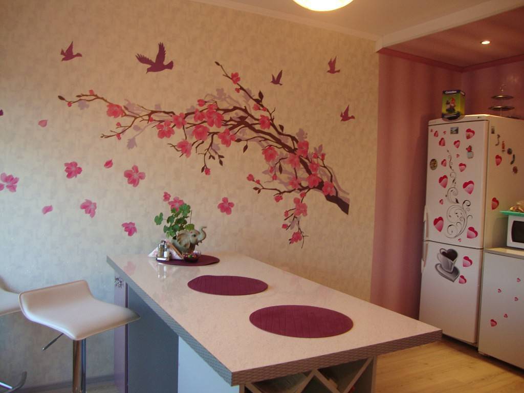 Сиреневая кухня сочетается с обоями белого, лилового, розового, голубого цветов. Для небольших помещений используют однотонные полотна, для просторных — обои с принтом.