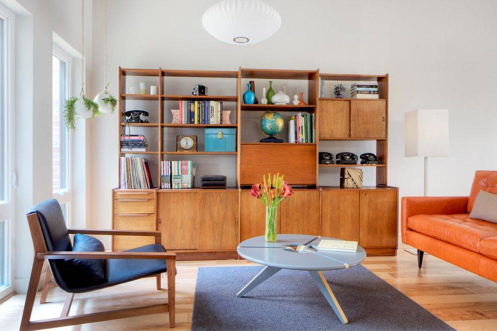 Яркий оранжевый цвет на стене в гостиной смотрится очень эффектно