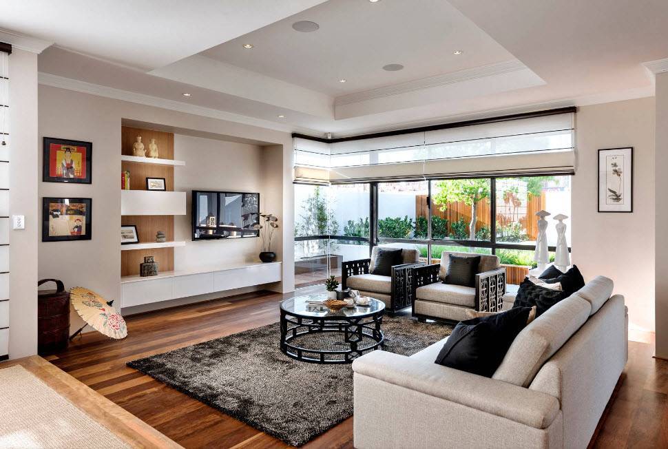 Восточный. В гостиной, оформленной в этом стиле нет места для высокой мебели и громоздких шкафов, ведь их заменяют подушки, пуфы и тумбы. Данное направление станет идеальным решением для маленьких комнат, где для большой мебели в принципе нет места. Если оформить гостиную в японском стиле, то тогда светлые стены сочетают с темной мебелью, декор при этом отсутствует.
