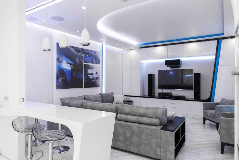 В современном интерьере он занимает главное место и предполагает максимум свободы в пространстве. Поэтому для обстановки комнаты подбирают функциональную и компактную мебель. Хорошим вариантом для маленького зала также станут модели трансформеры и встраиваемая техника. Чтобы помещение выглядело уютно, в качестве декора можно использовать небольшие полочки с подсветкой. Диван в таких гостиных занимает центральное место, его обивка должна быть однотонной и яркой, допускаются также небольшие узоры в виде четких линий.