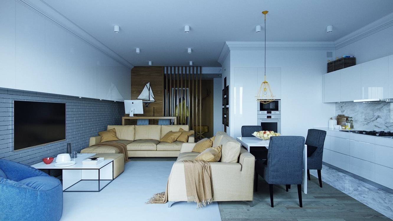 При создании дизайнерского проекта необходимо четко определить, где какая зона у вас будет располагаться. Отделить кухню от комнаты можно при помощи барной стойки или специальных дверей-купе.