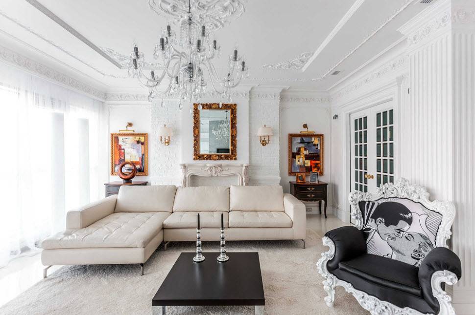 Классика. Антикварная мебель из темной древесины с белоснежной обивкой – это идеальное решение, которое позволит сделать интерьер более светлым и просторным, современным и жизнерадостным. Дополнить ансамбль поможет мраморный камин и белая штукатурка. Если же решено, что белой будет мебель гостиной, то лучше всего она будет смотреться на фоне теплых и пастельных тонов. Также для передачи цвета можно использовать белое ковровое покрытие или журнальный столик.