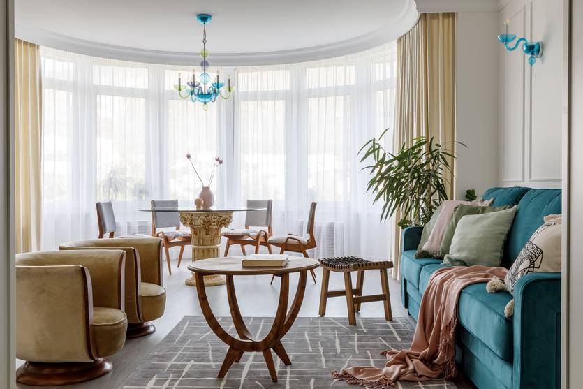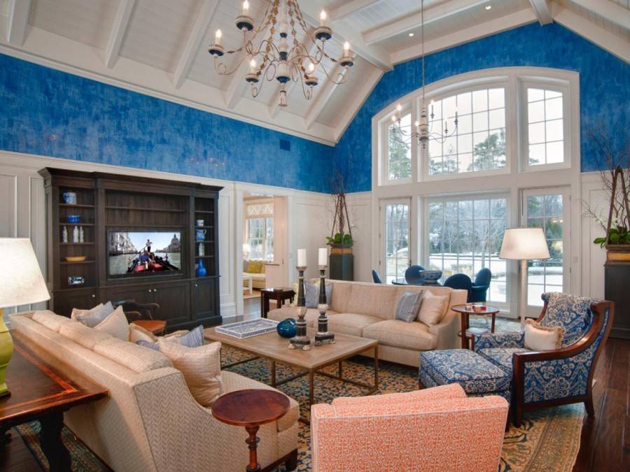 Синий. Для гостиной подойдут и нейтральные светлые, и насыщенные темные цвета, даже такие, как индиго / электрик. Учитывать насыщенность обязательно: светло-синие решения неприхотливы в плане подбора мебели, а вот с темными ситуация сложнее.