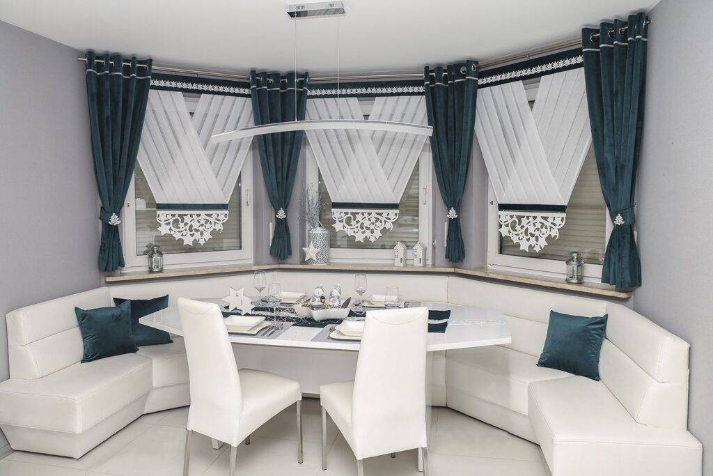 Для дополнения эркерных окон в интерьере можно использовать различные варианты штор: