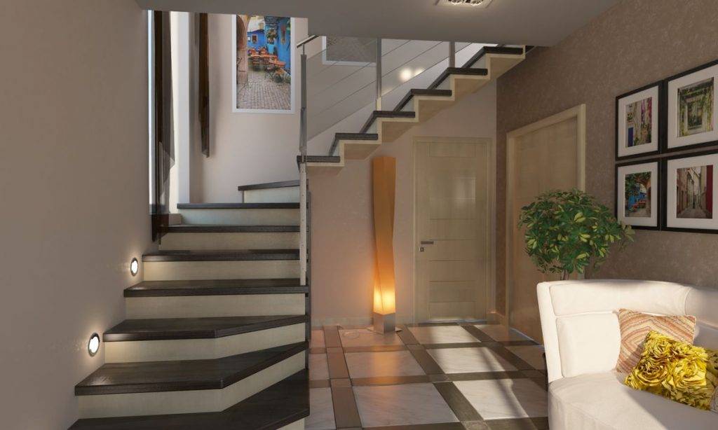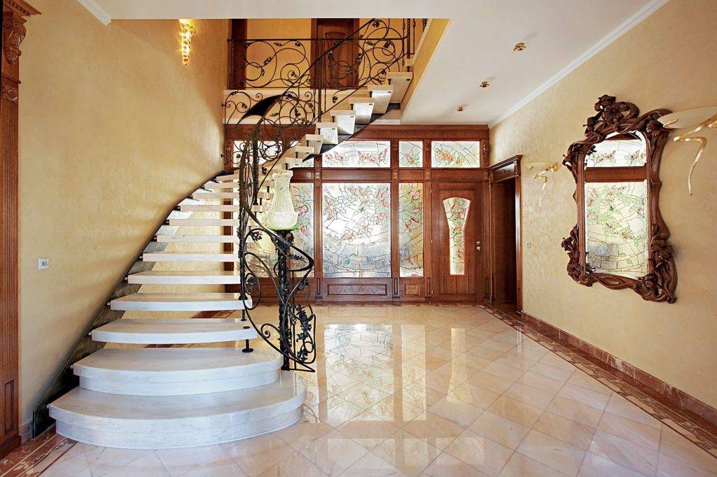 Отделочное декорирование должно гармонично сочетаться с лестницей в прихожей. Ведь первое, что видит гость или сам хозяин, заходя в помещение, ‒ это коридор или холл. Лестничная конструкция может быть двух видов: занимает основное пространство комнаты, компактный вариант без акцентирующих элементов. Советы по оформлению:
