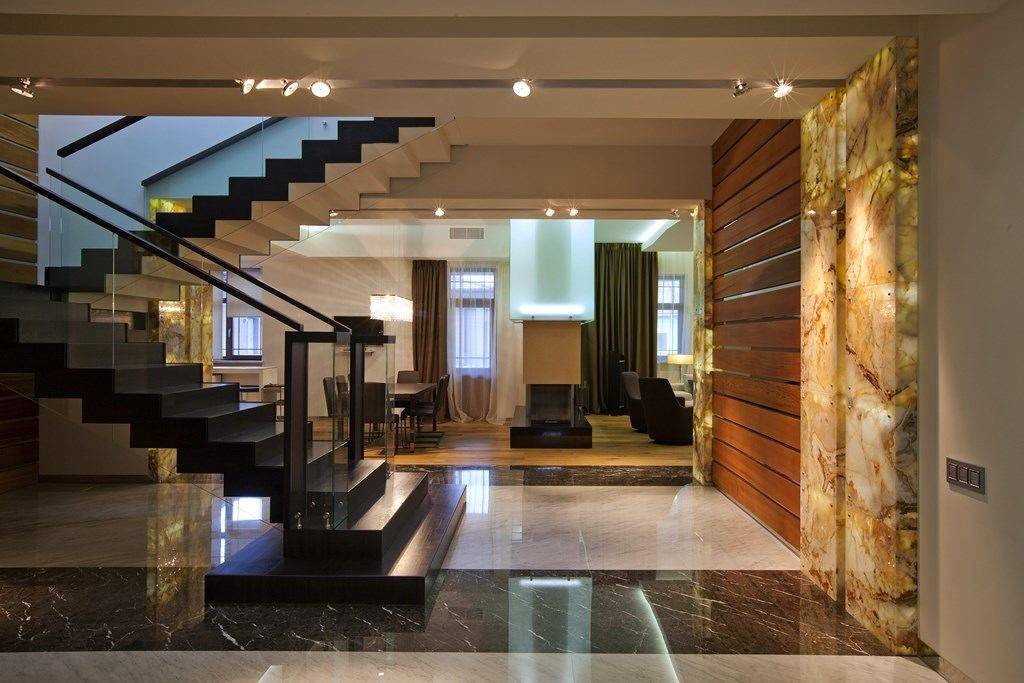 Сюда нередко выходит лестница, ведущая на верхний этаж. Это особая часть жилища, которая выполняет множество функций и требует специфического дизайнерского решения.