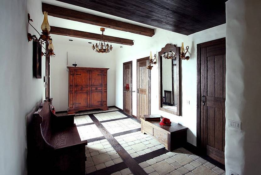 Высокий, просторный холл можно украсить многоуровневым потолком, но, иногда уместна гладкая, ровная поверхность. Модные декоры – лепнина, витражи, мозаика, рисунки ручной работы. Универсальная отделка – простой белый потолок со встроенными источниками освещения. Для стилей кантри и прованс монтируются деревянные балки, характерные для сельских домиков.
