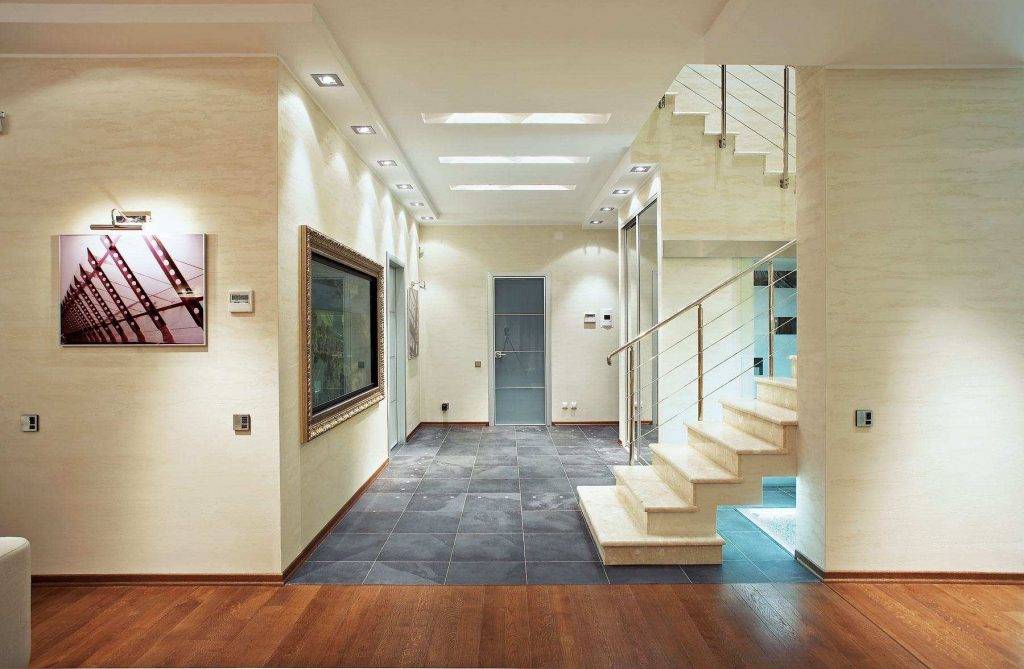 Выбрать материалы для ремонта прихожей, необходимо, имея четкое понимание того, что такое холл в частном доме, какие функции он исполняет. Если прихожая – проходной буфер, не стоит вкладывать большие деньги и создавать особое декоративное пространство. Достаточно стены и потолок просто покрасить, на пол положить керамическую плитку или камень. За такой поверхностью будет проще ухаживать.