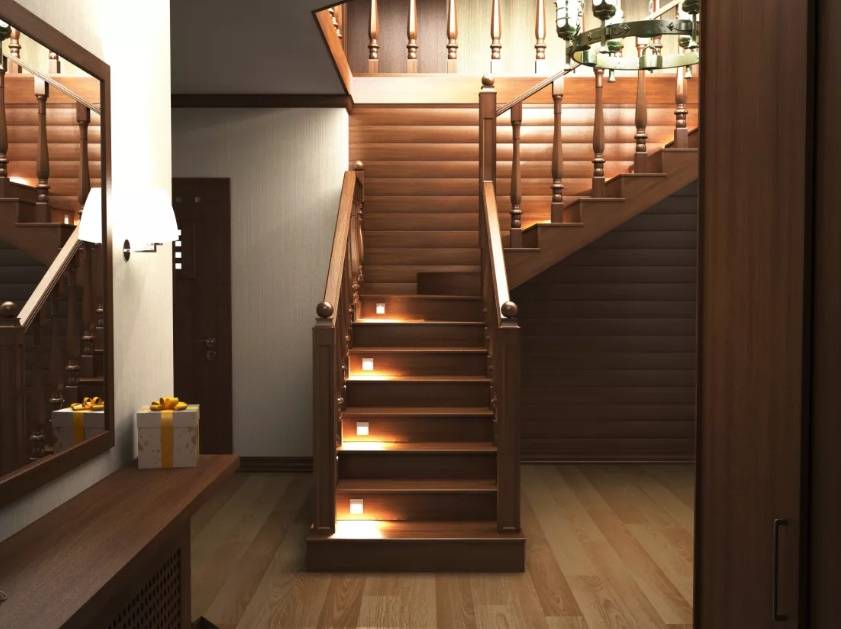 Вид освещения подбирается в зависимости от того, какой выбран дизайн холла и лестницы. Светодиодная точечная подсветка используется в современных интерьерах, а настенное бра – в классических.