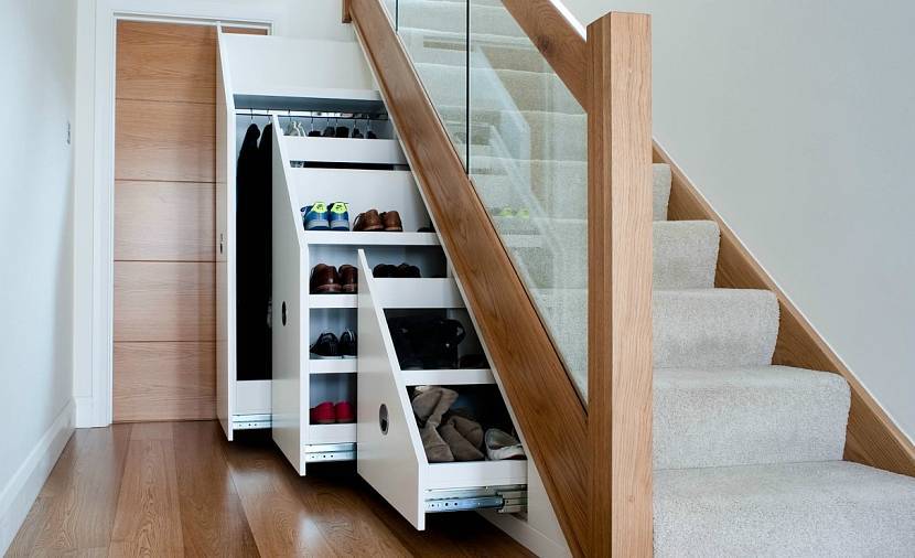 - В маленькой прихожей разумно использовать подлестничное пространство: ниши, выдвижные ящики, полки.