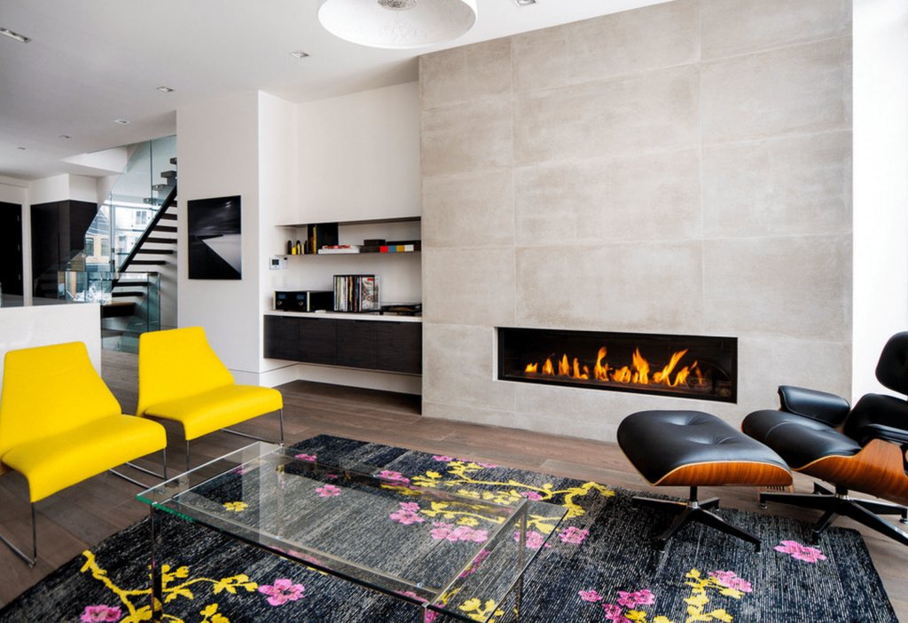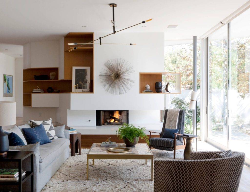 Уютную атмосферу поможет создать камин, он может располагаться как в центре комнаты, так и в любой из его зон.