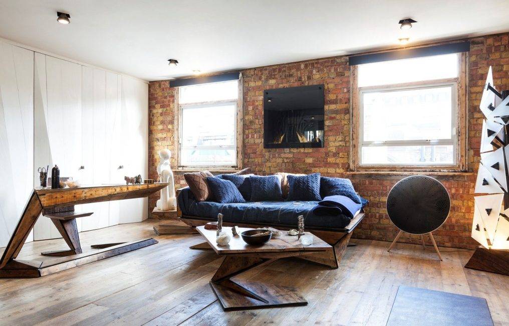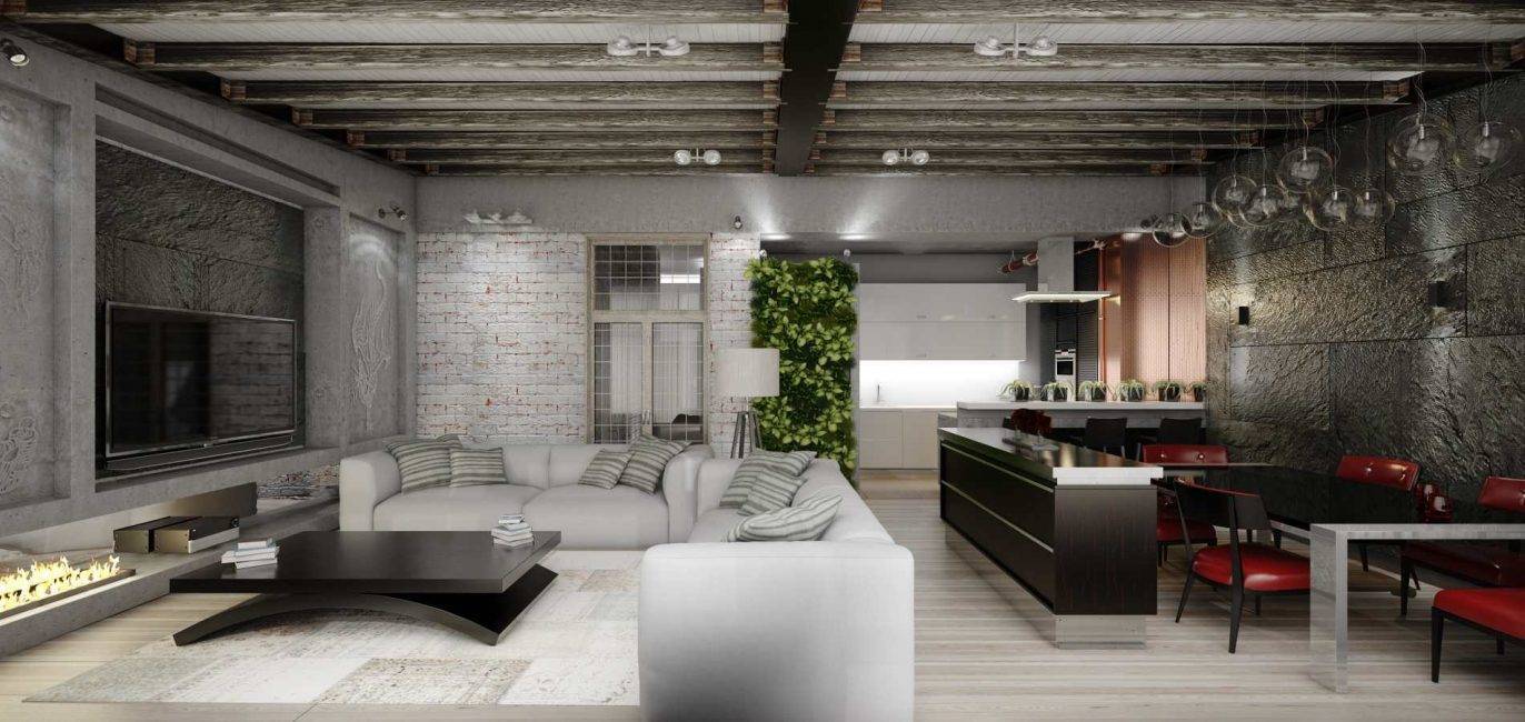 Характерной чертой гостиной в стиле лофт является отсутствие отделки стен и потолков