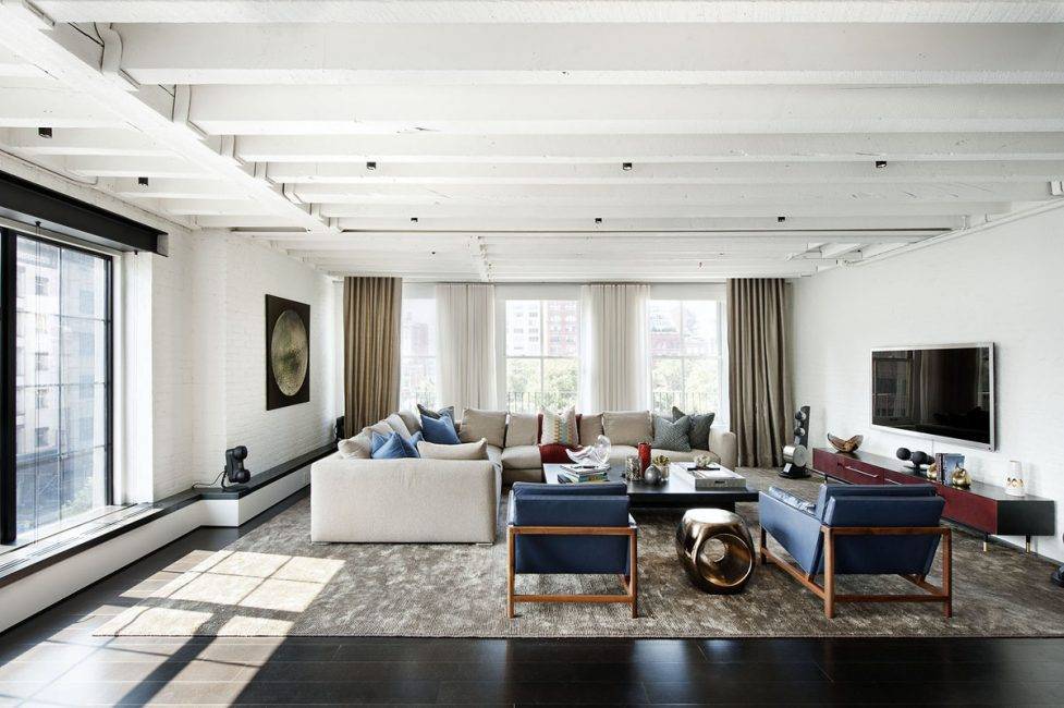 Мебель крупная, если не сказать гигантская, в то же время, приветствуется простота ее дизайна. Обязательными элементами гостиной в стиле лофт являются телевизор и диван, которые должны сделать помещение еще более уютным.