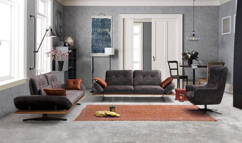 Диван – это, пожалуй, наиболее яркая деталь гостиной, которая может иметь контрастирующий с обстановкой цвет. Так, если стены и потолки серые, то софа может быть красной. Также здесь может быть огромный и высокий стол, его чертами является простая форма и наличие массивной столешницы из дерева.