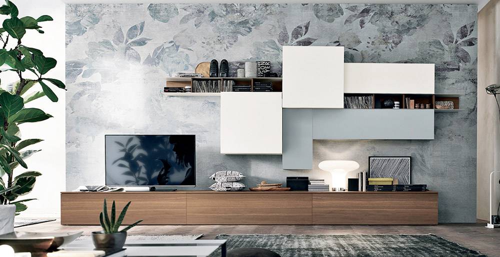 Можно купить набор из двух шкафов и тумбы. На тумбочку устанавливают телевизор и помещают ее в центре композиции. Шкафы устанавливают по углам стены. В зависимости от варианта исполнения в них можно хранить книги, посуду или диски с фильмами.