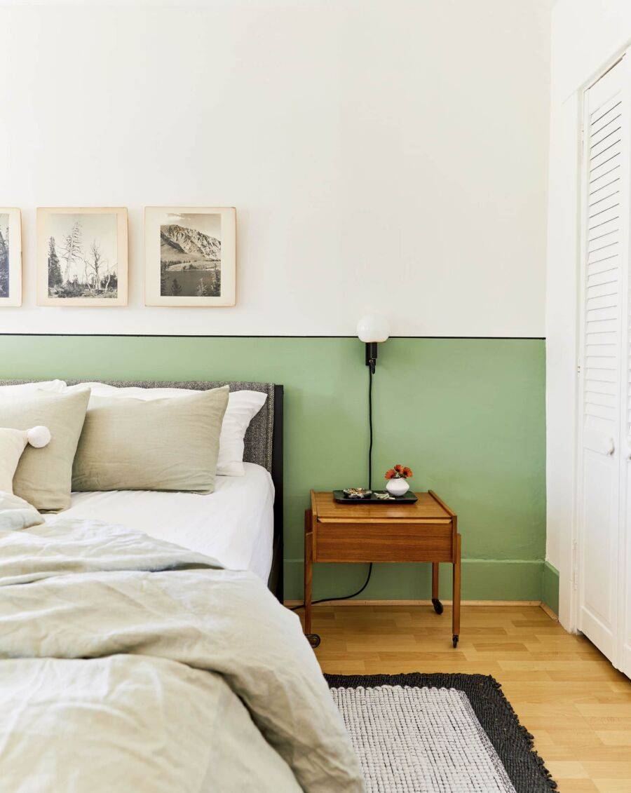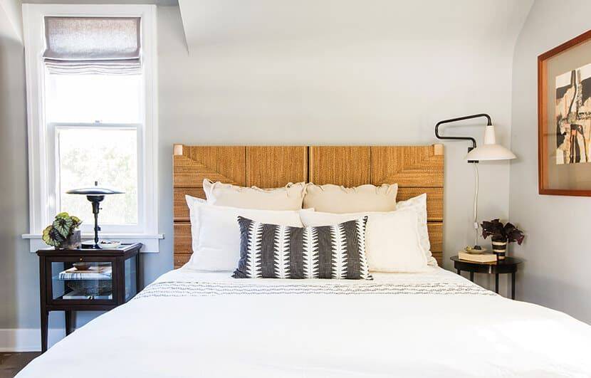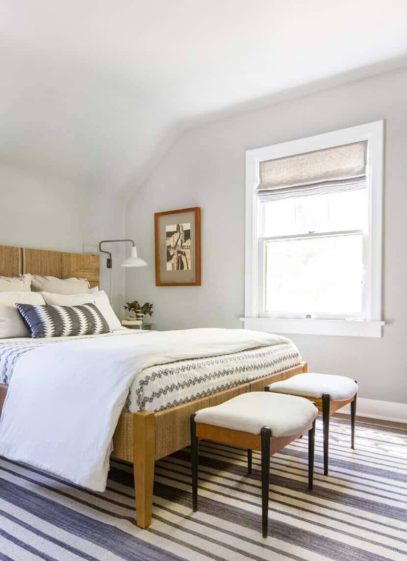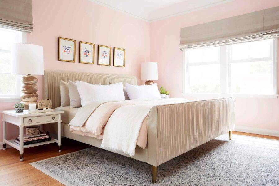 Чисто белый цвет не подходит для спальни на южной стороне – он будет «слепящим» в солнечные летние дни. Подойдет любой холодный оттенок, который смягчит яркие лучи солнечного света. Это размытый мятный или голубой, жемчужно-серый, бледно-розовый или нежно-сиреневый цвет.