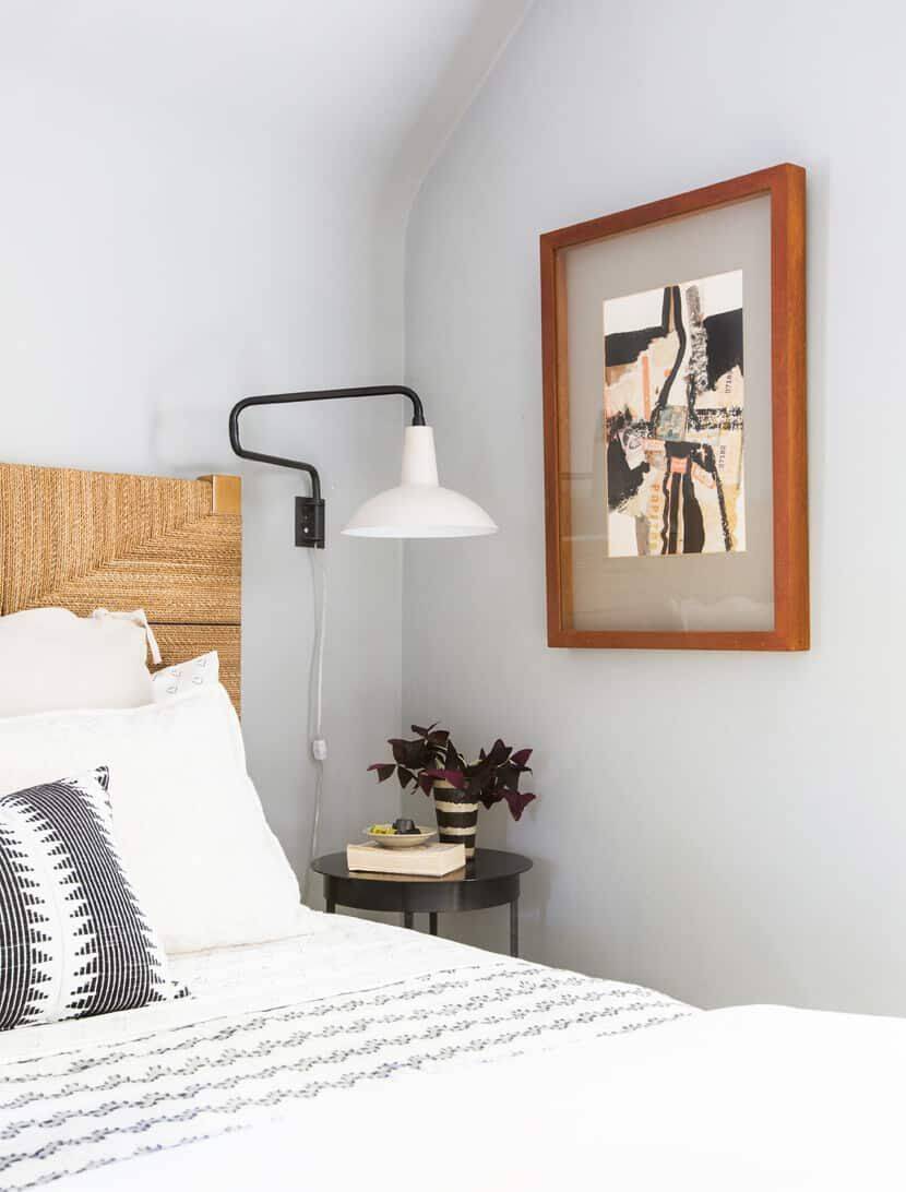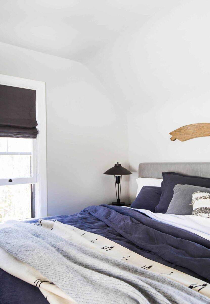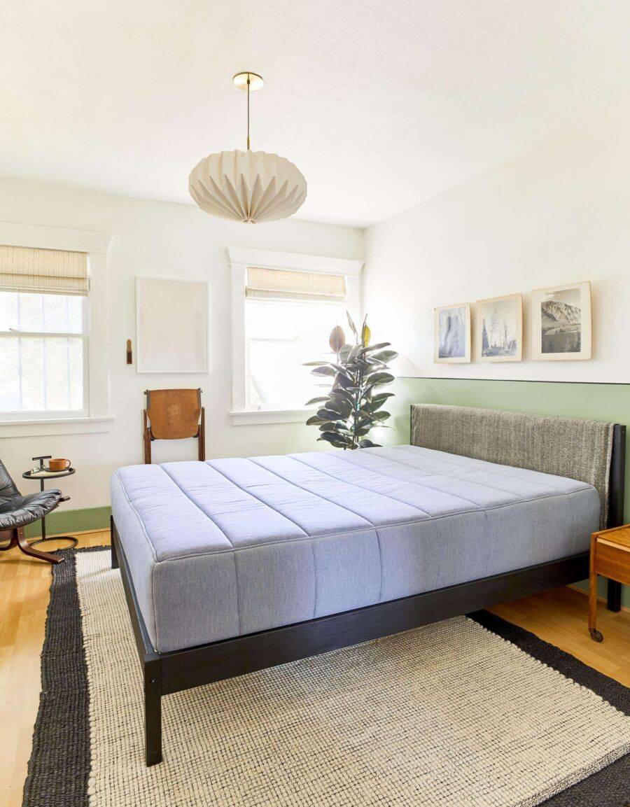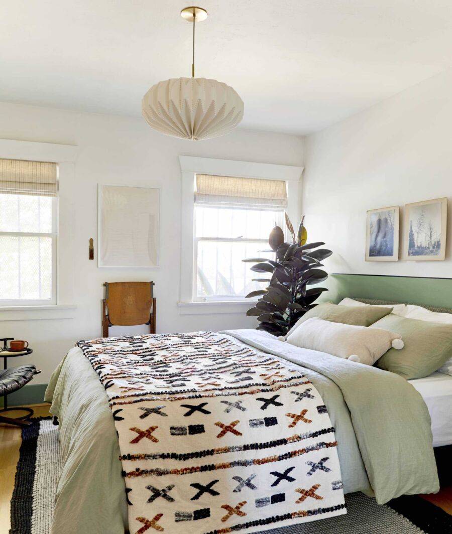 Чисто белый цвет не подходит для спальни на южной стороне – он будет «слепящим» в солнечные летние дни. Подойдет любой холодный оттенок, который смягчит яркие лучи солнечного света. Это размытый мятный или голубой, жемчужно-серый, бледно-розовый или нежно-сиреневый цвет.