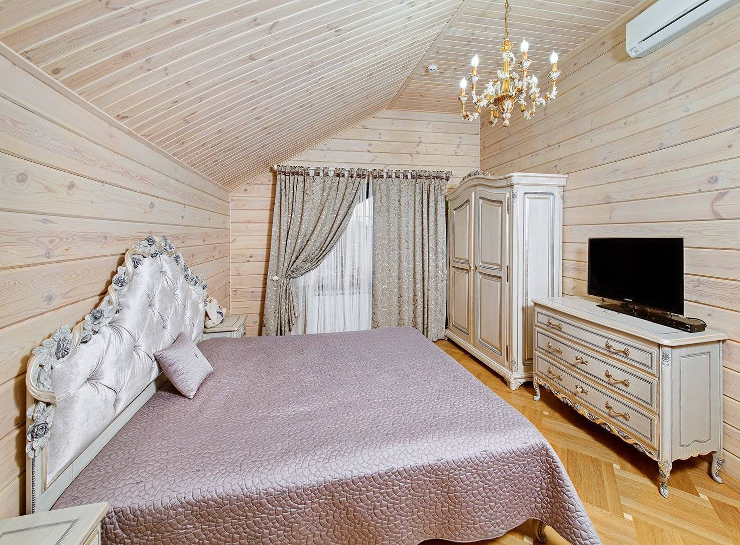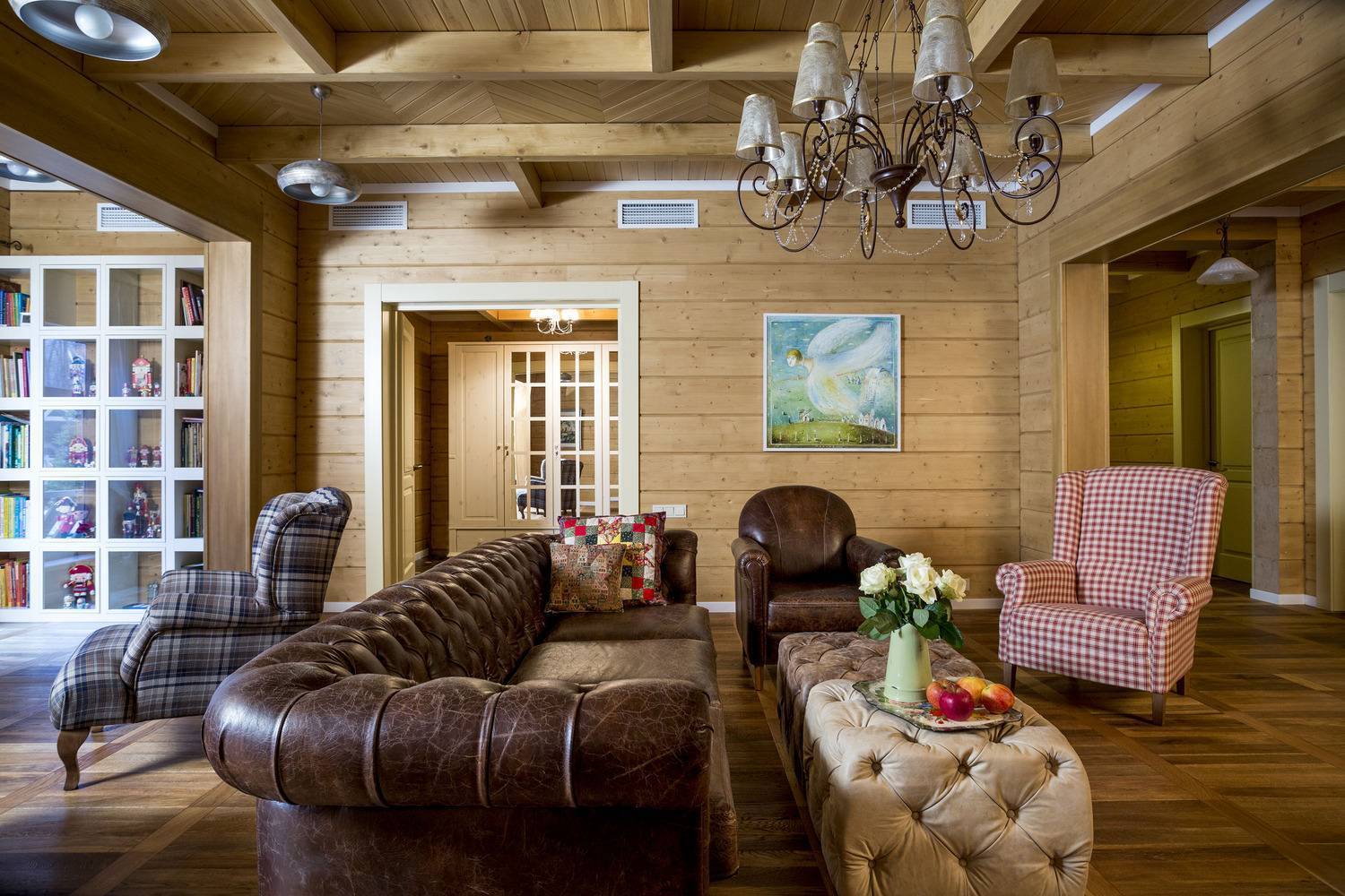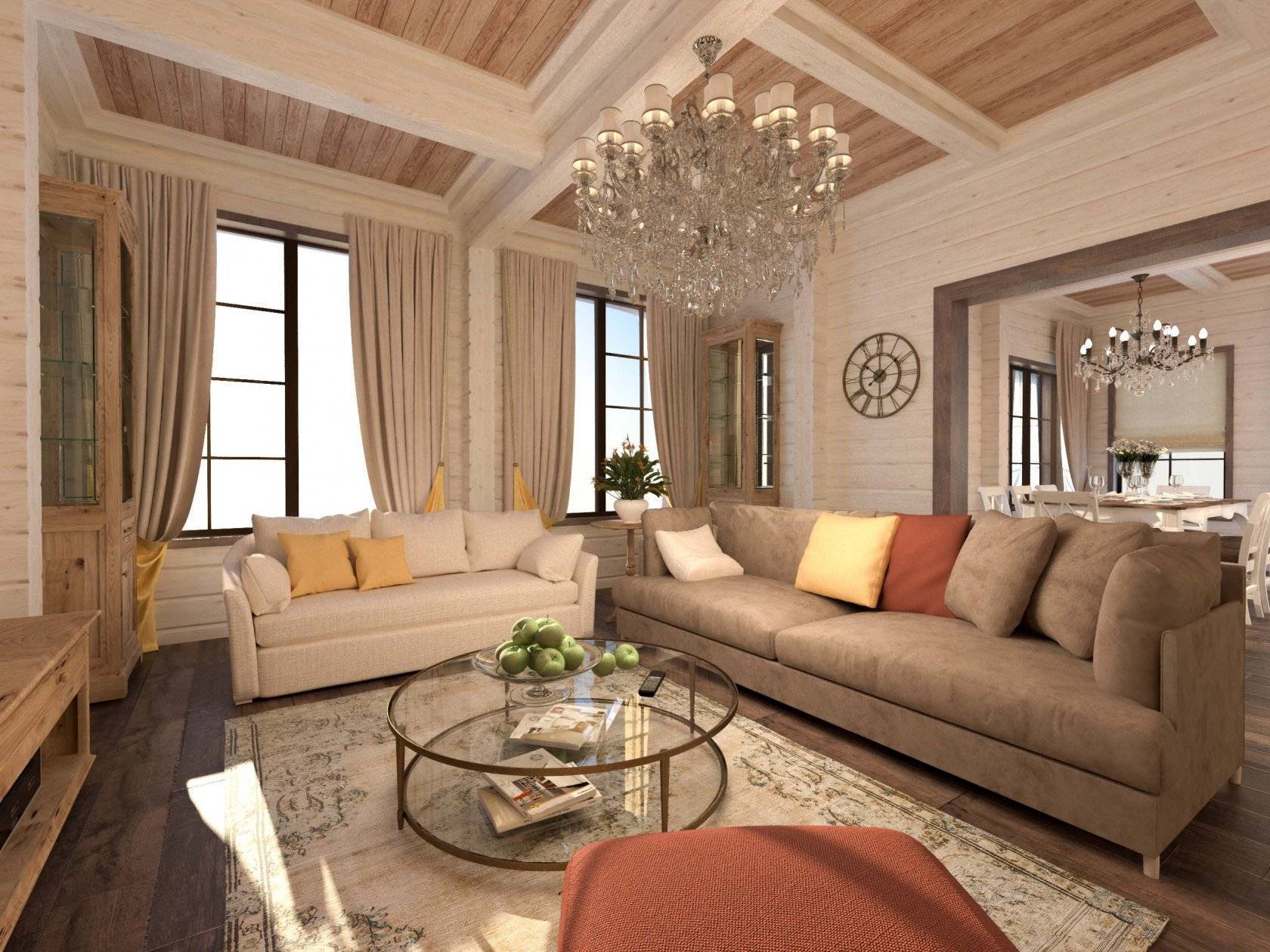Деревенский стиль сочетает в себе минимализм скандинавов и ажурность прованса. Стены и потолок не обшиваются, а только покрываются лаком. На полу обычная доска или пробка.