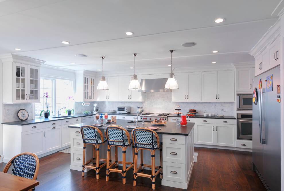 Неоклассика – наилучший дизайн для просторной проходной или совмещенной кухни частного дома. Главные требования этого стиля – большая площадь и высокие потолки.