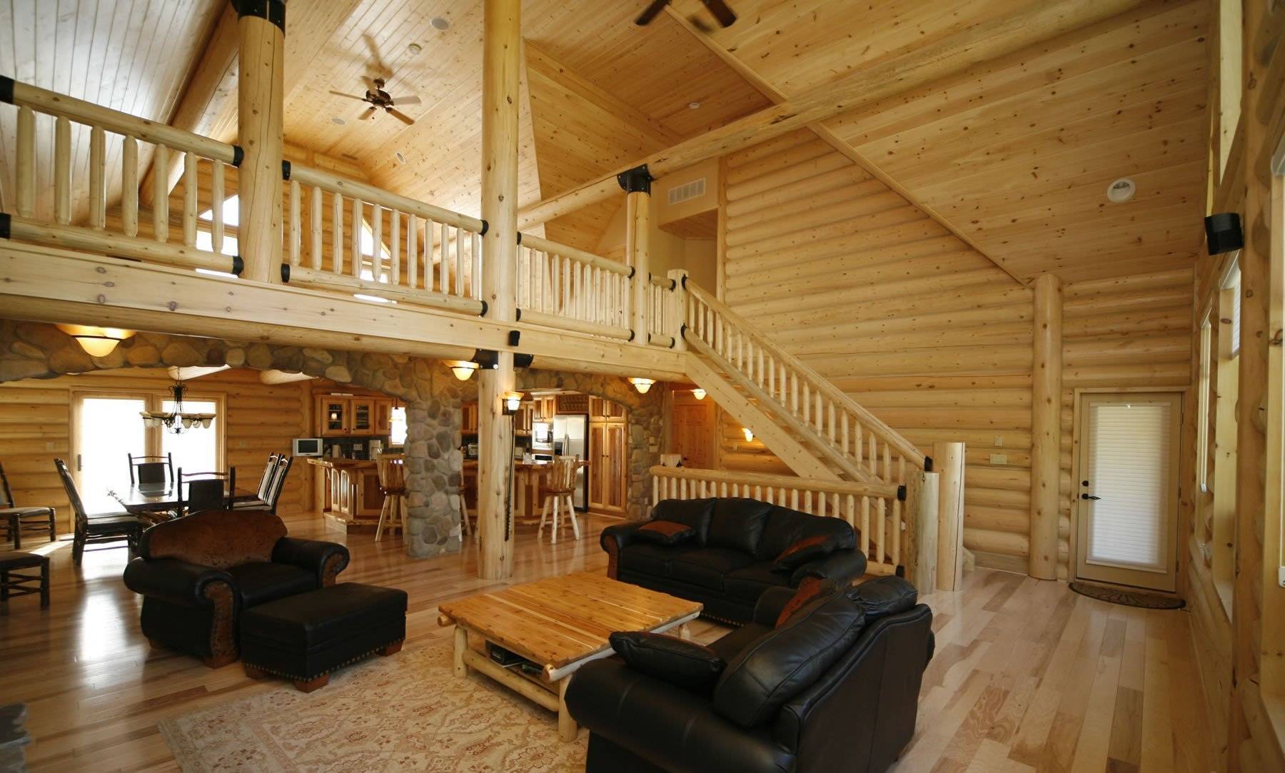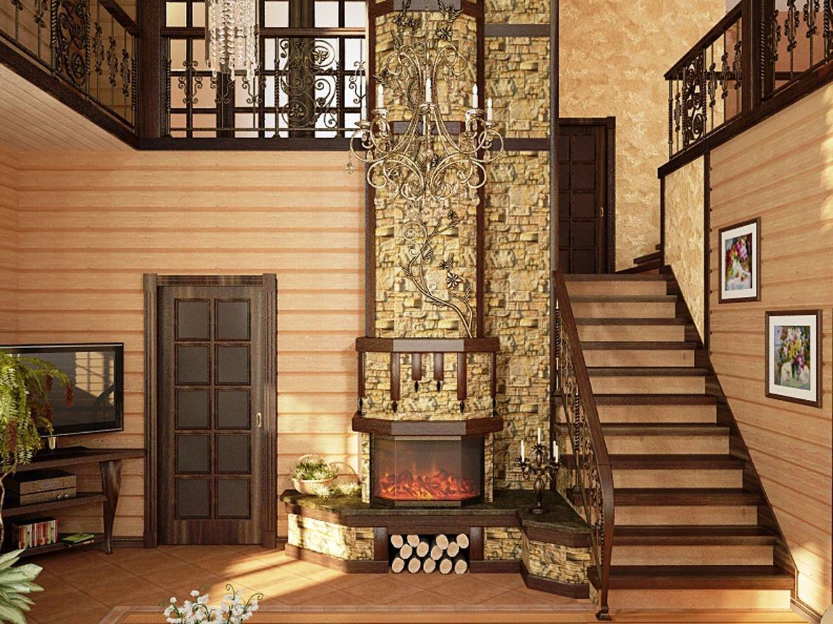 Натуральное дерево и камень – превосходный дуэт для облицовки. Из металла дизайнеры предлагают выбирать фурнитуру и светильники из бронзы или меди (не серебро и хромированную фурнитуру). Комплекты мебели с такой отделкой выгодно подчеркивают самобытность сруба.
