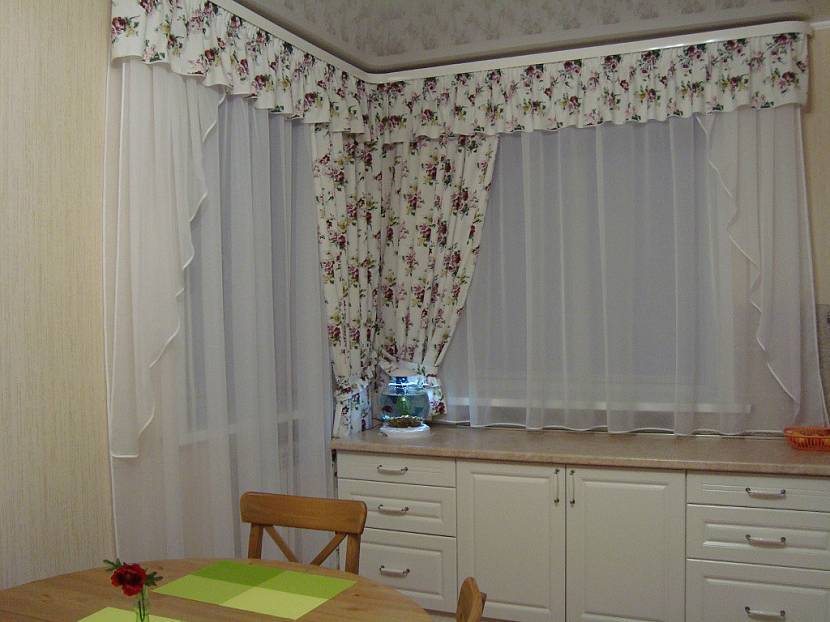 Шторы можно повесить с декоративными элементами, кистями — главное, чтобы они не были слишком тяжёлыми, «дворцовыми», или слишком тёмными. Приветствуется наличие на полу разноцветные половики, вязаные коврики на табуретках и стульях, красивая скатерть и салфетки на обеденном столе, а также различная «деревенская» посуда — кувшины, горшки, разноцветные тарелки, сложенные красиво стопками.