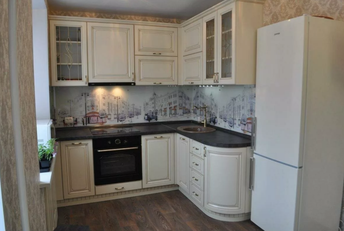Угловое размещение кухонной мебели – самый компактный вариант. Небольшие кухни, 5-6 квадратных метров – вот основной объект такого оформления. Кухни хрущевок, с их мизерной квадратурой до 4 кв. м., не позволит обставить так мебель, а вот немного побольше – уже пожалуйста.