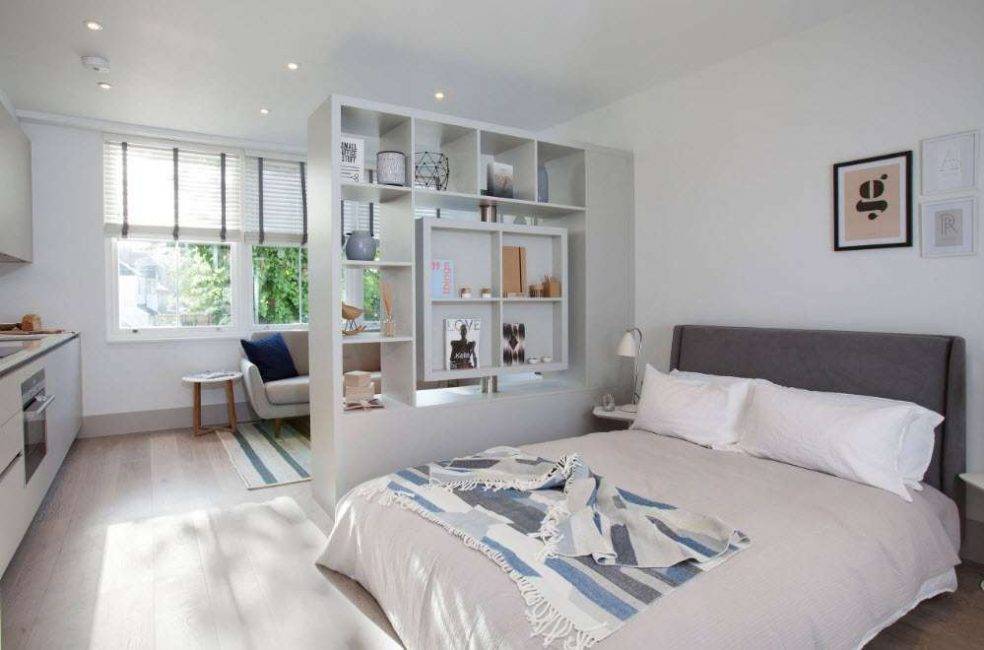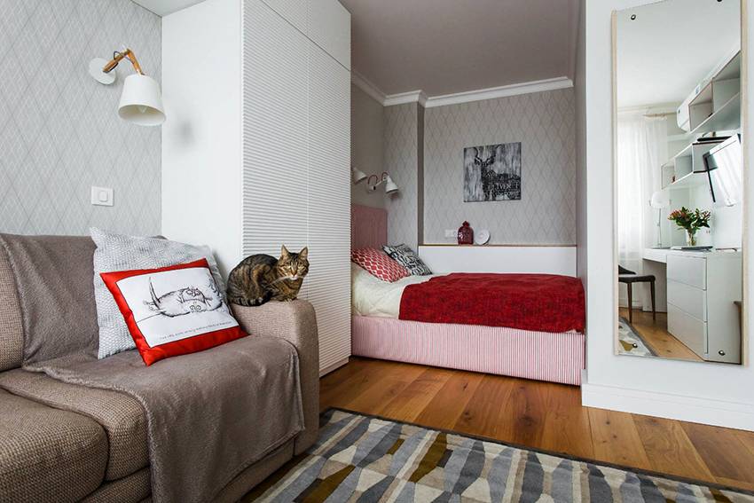 Логичное использование пространства – задача владельца небольшой квартиры (16 кв. м). Разграничить площадь на зону гостиной и спальни поможет мебель:
