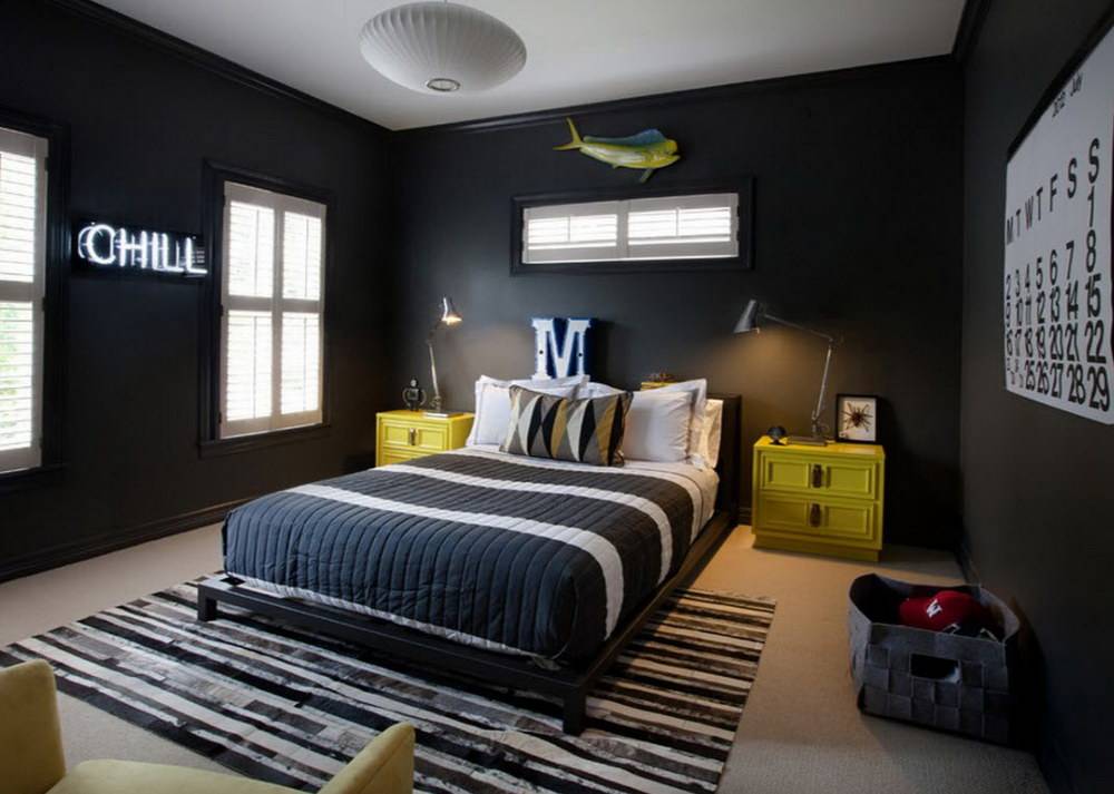 Комнату можно отделать в белом цвете в сочетании с черным, и добавить несколько ярких ноток, расставив сочные акценты. Например, поверхность стены над спинкой кровати декорировать в черный, а остальные стены сделать светлыми, изголовье при этом может быть насыщенным желтым, как и подушки на кровати.