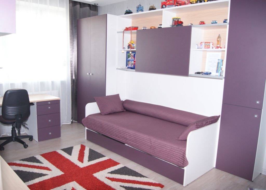 Если под детскую для подростка как обычно осталась маленькая комната, придётся задействовать высоту. Стандартный вариант — кровать чердак. Сама кровать поднимается на 2-ой уровень, а на первом делаем диван, шкаф или стол. Применяется часто и уже не является экзотикой. Или хотя бы выдвижные ящики под кроватью.
