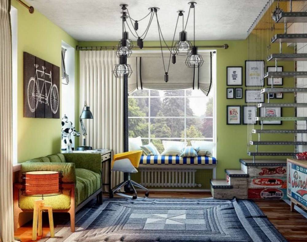 Такой интерьер понравится креативным молодым людям, приверженцам нестандартности во всем, включая дизайн помещений. Для обустройства можно использовать необычную мягкую мебель, вращающиеся полки и оригинальные системы хранения.