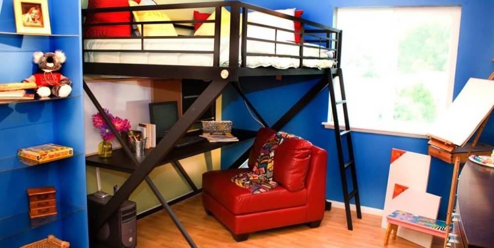 Вариант кровать-чердак, когда пространство для сна размещается над столом, не теряет популярности. Это понятно, ведь такое расположение не только позволяет экономить метры, оно также создает дополнительный уют. Вспомните, как приятно спать на верхней полке в купе поезда! Для подростка такой вариант — возможность получить идеальное место для релаксации и пару дополнительных свободных метров в комнате.