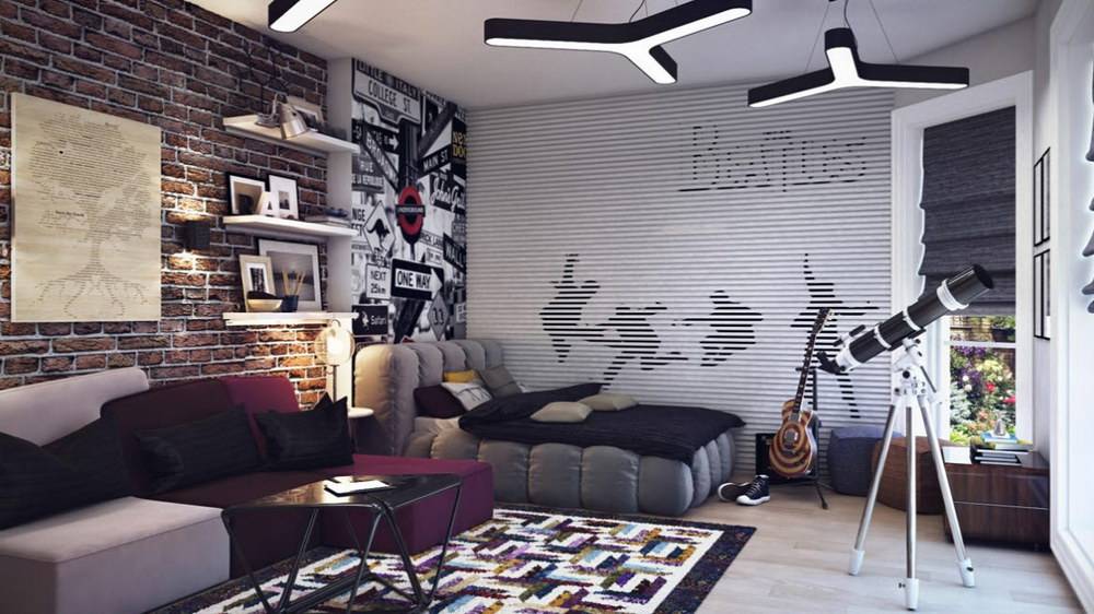Это идеальное решение для поклонников спорта, авто и мото, а также ценителей брутальности. Для такой комнаты характерно преобладание коричневого в сочетании с кремовым, бежевым оттенком. Стены отделываются кирпичом или обоями, рисунок которых имитирует каменную кладку. В интерьер прекрасно впишется однотонная мягкая мебель и современная техника. Уместно будут смотреться светлые занавески, темные покрывала. Используемые материалы для напольного покрытия – ламинат, плитка, ковролин.
