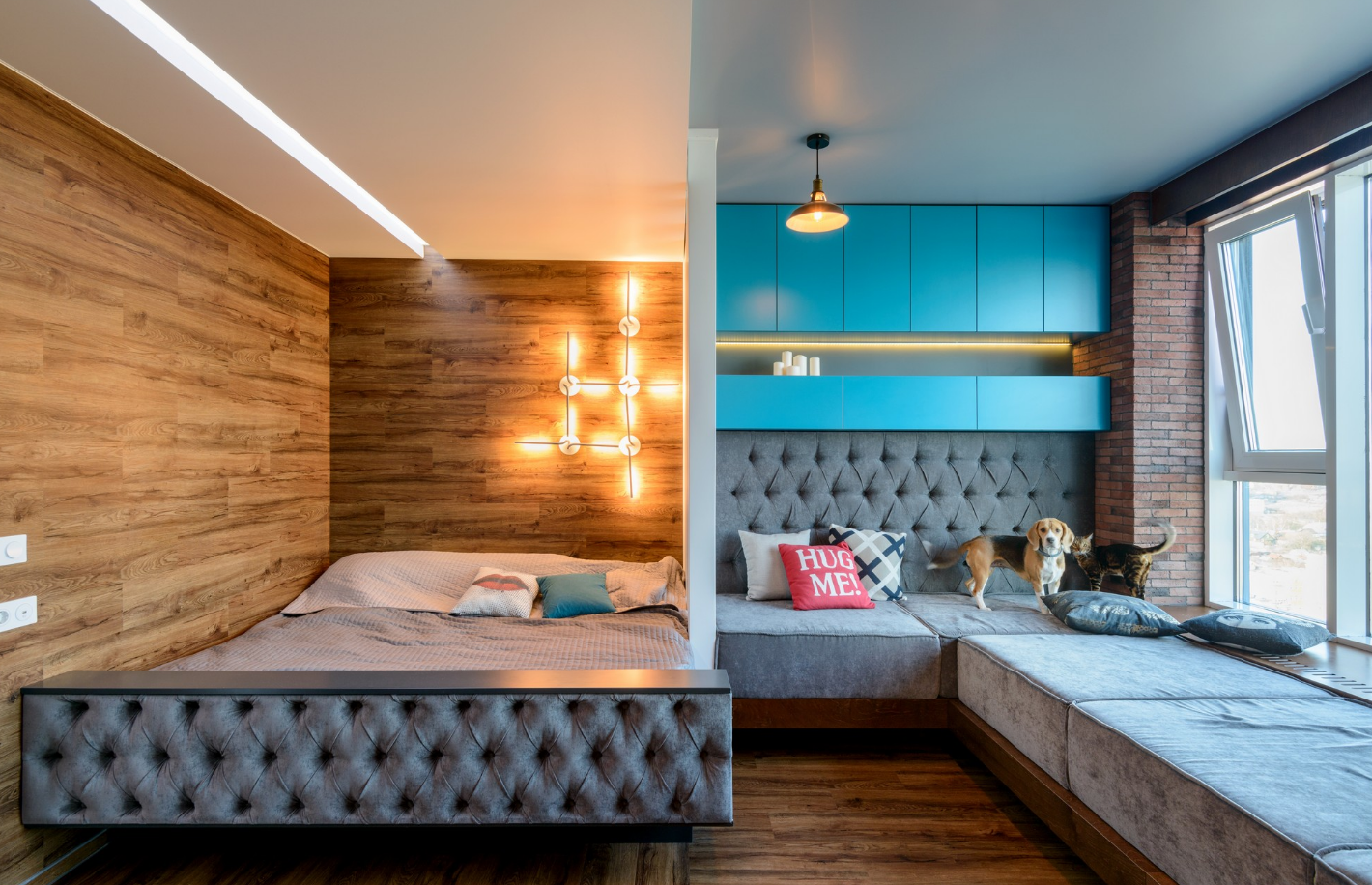 Ещё одно правило выбора мебели — использовать два коротких предмета мебели вместо одного длинного. Или высокий вместо широкого. Это означает, что стенку во всю длину стоит заменить на пару элегантных шкафов. Вместо 3-метрового дивана предпочесть 2 по 1,5 метра.