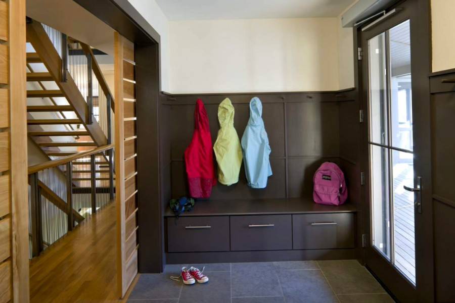 Крыльцо-прихожая часто встречается в деревенских домах. Обставить его можно красиво и современно, однако следует использовать минимум мебели. Подойдет один небольшой закрытый шкаф, а также крючки и открытые полки. Хорошо, если дизайн будет гармонично сочетаться с фасадом дома.