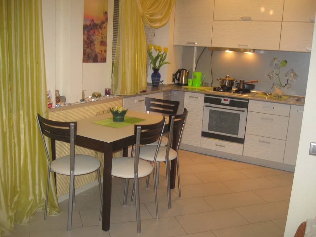Такой вариант увеличения полезной площади приемлем, когда лоджия практически не используется. Утеплив и застеклив лоджию можно организовать уютную обеденную зону кухни.