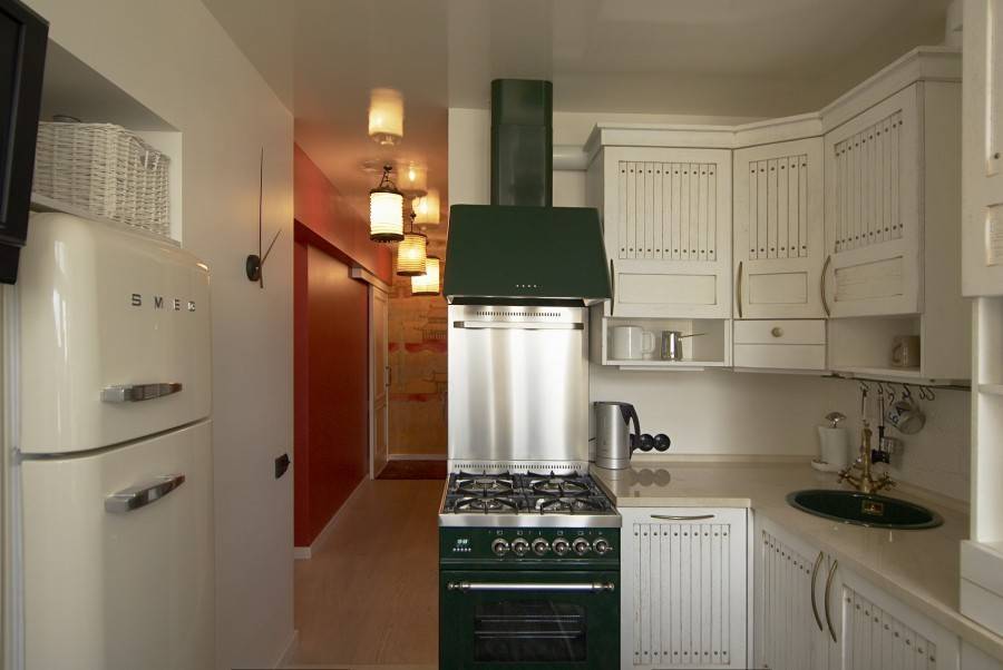 Чтобы оставить больше места для кухонной мебели (в том числе обеденной группы), холодильник можно и вовсе вынести в коридор. Это не слишком удобно, но иногда просто необходимо.