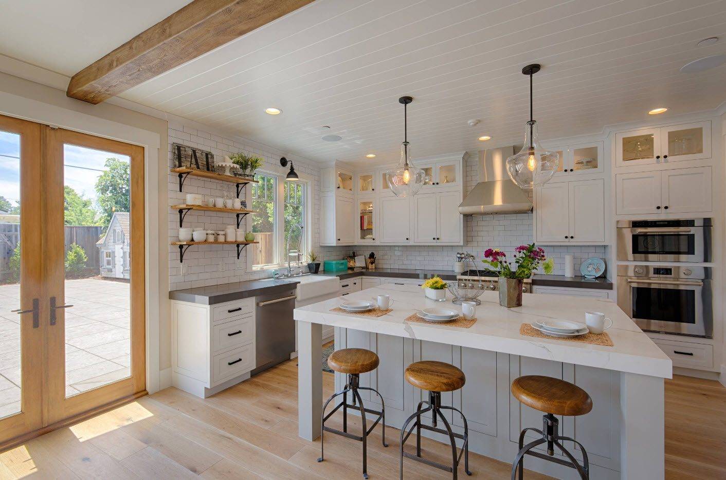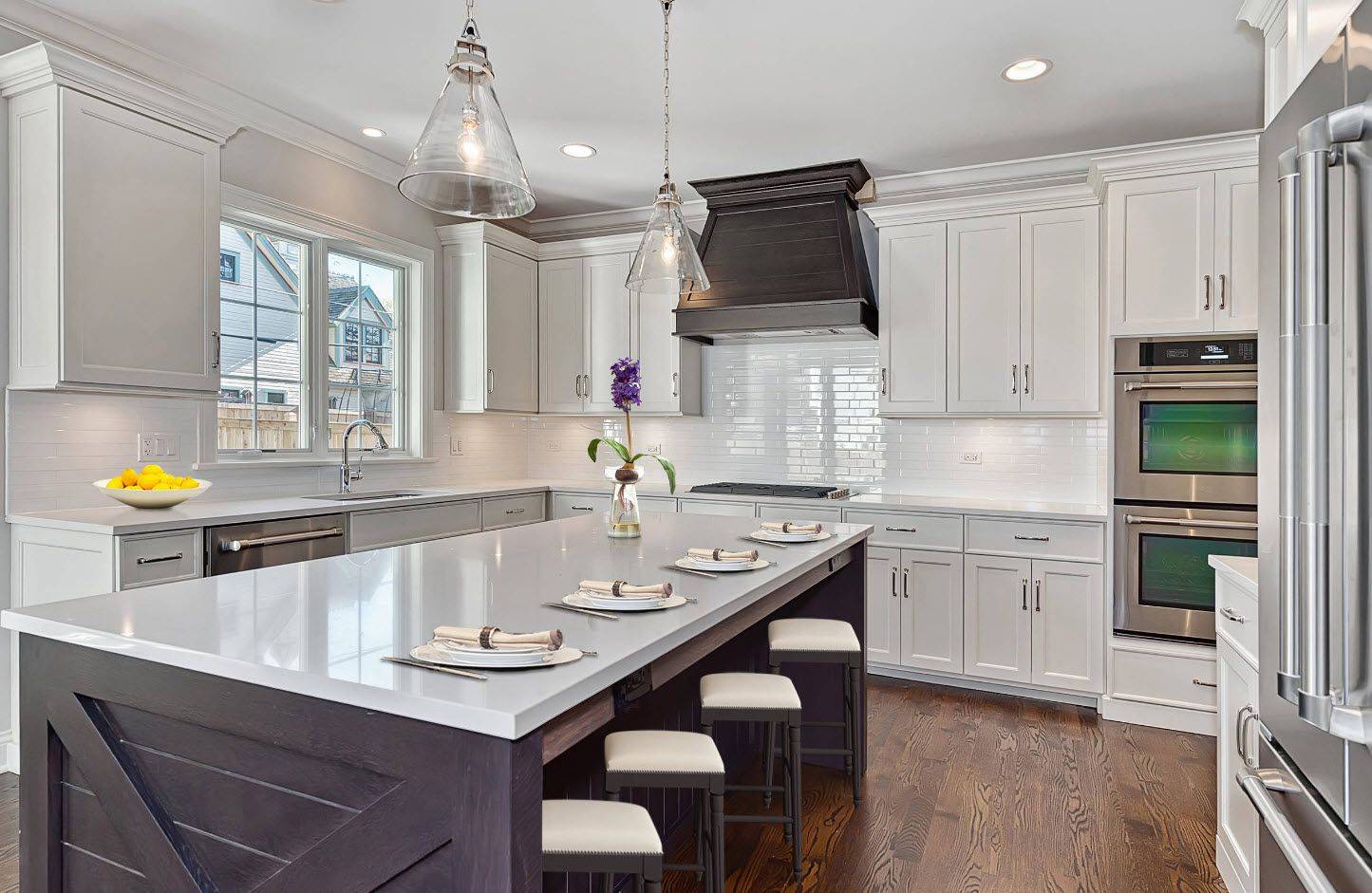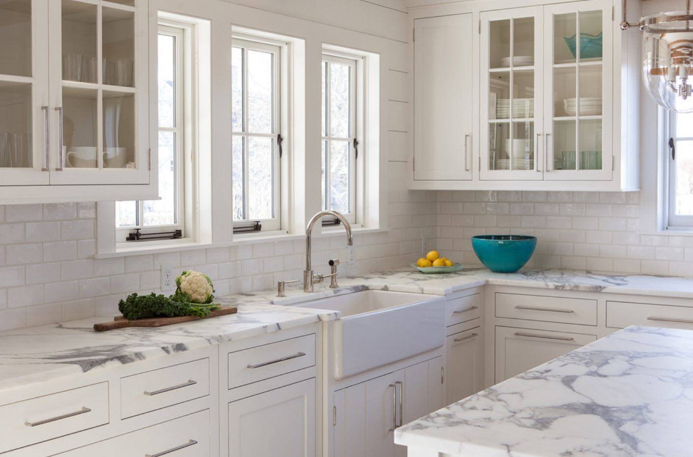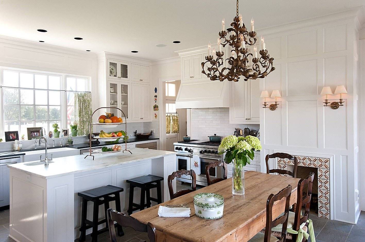 Грамотное сочетание белого гарнитура с элементами отделки и мебелью в интерьере, где предусмотрено большое окно, создает впечатление, что кухня просторнее, чем на самом деле.