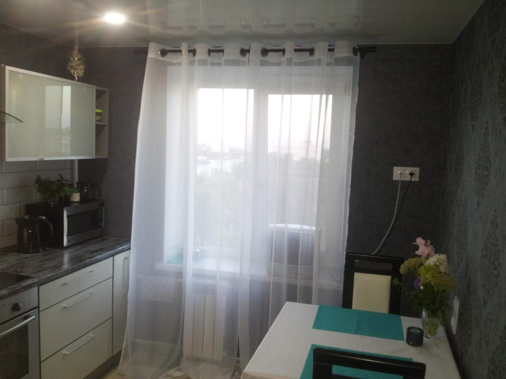 Нитяные шторы разделяют зону для готовки и столовую