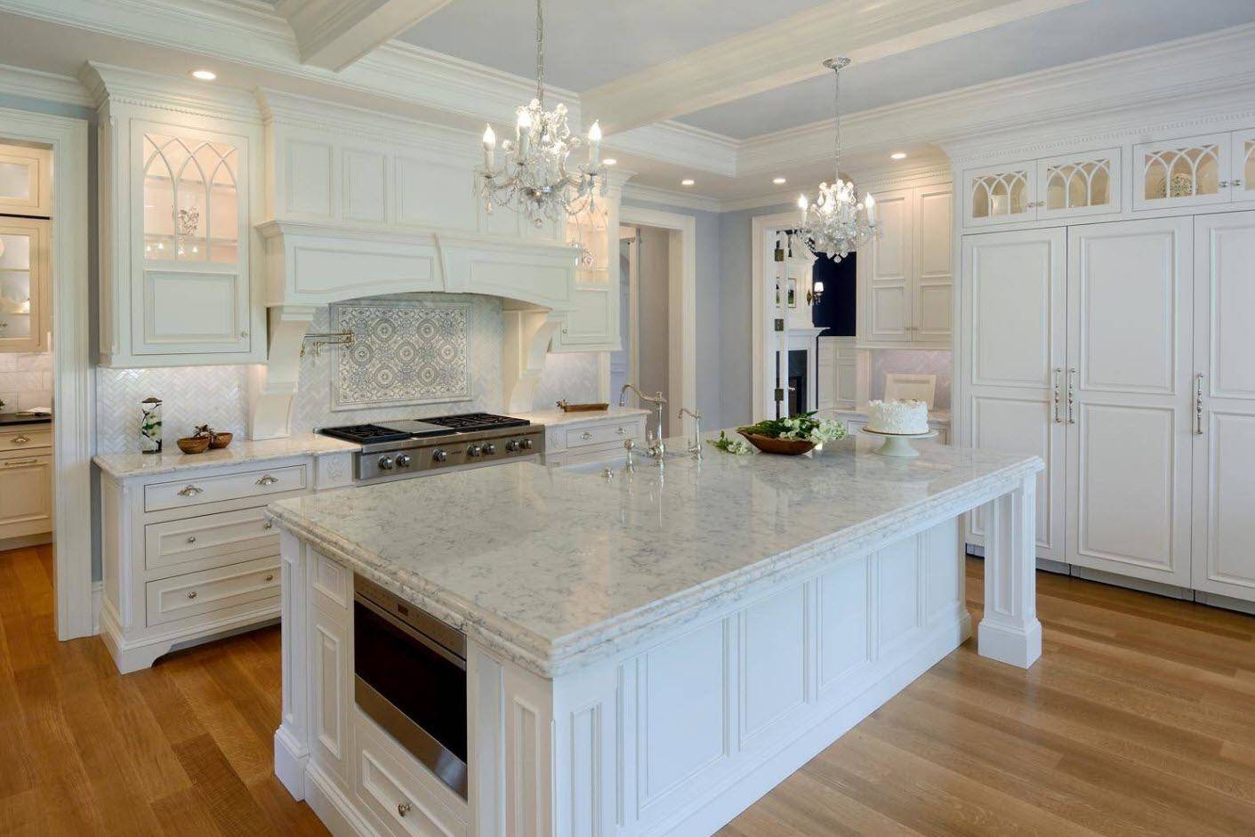 Классика. Представляет собой применение белых тонов, натуральных материалов, стеклянных вставок, позолоченной фурнитуры, хрустальных люстр.