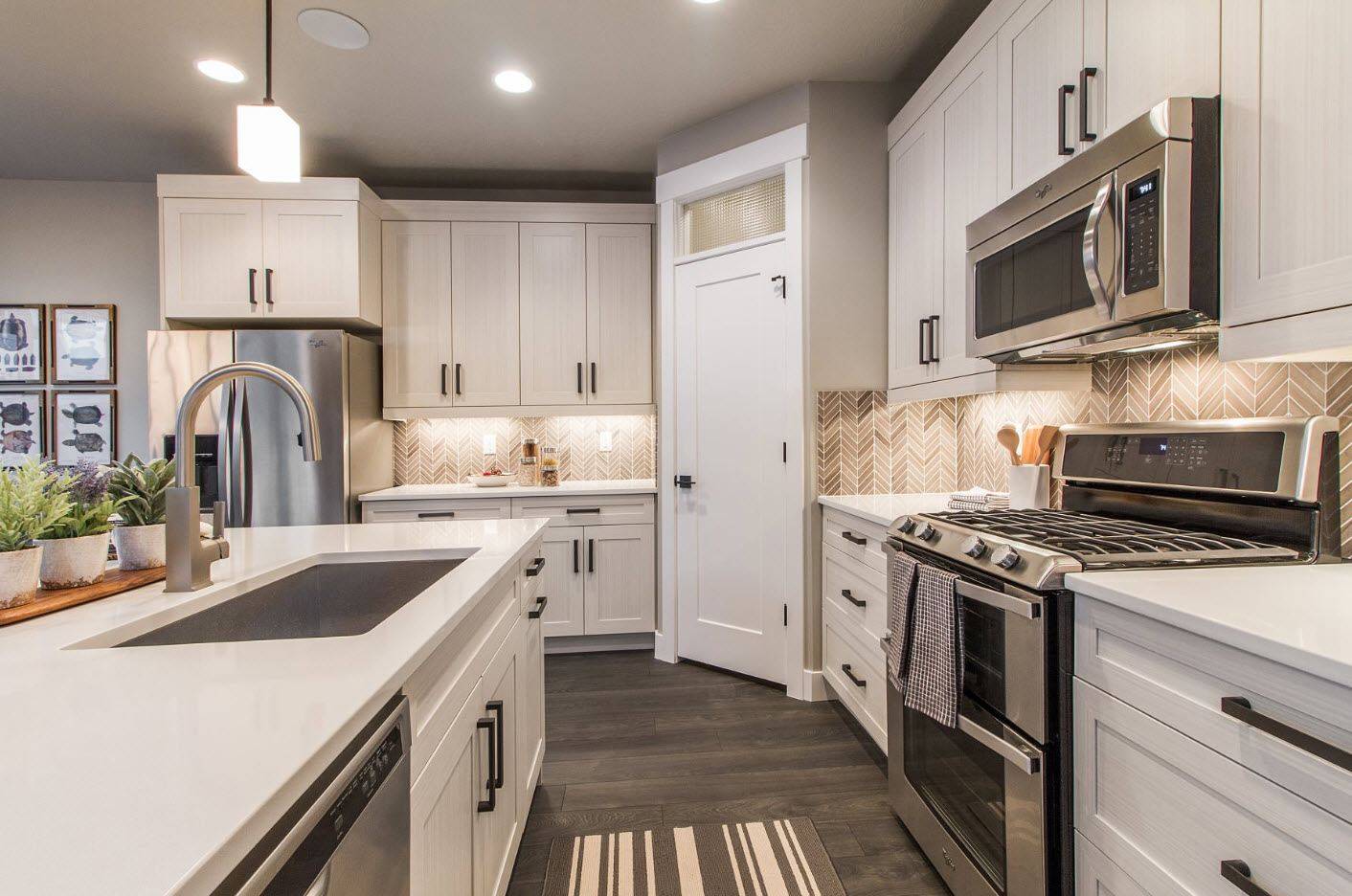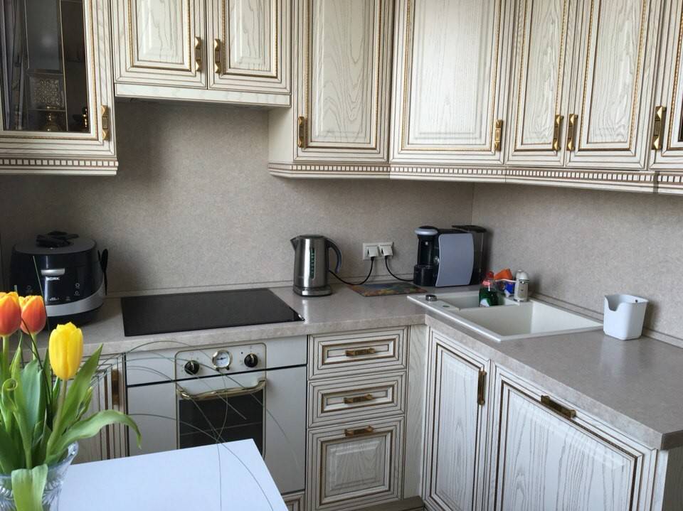 Не забывайте, что мебель гарнитура тоже должна соответствовать. Кухни в стиле современной классики, которые продаются в магазинах (в виде тёмной мебели с фризами и сеточками) – это вовсе не та классика, которая была раньше. Лучше не покупать эту пародию, а заказать мебель, которая будет выглядеть, действительно, к месту, если вы делаете классический интерьер. Также, ставьте латунные смесители, не забывайте о карнизах, люстре и прочих мелочах.