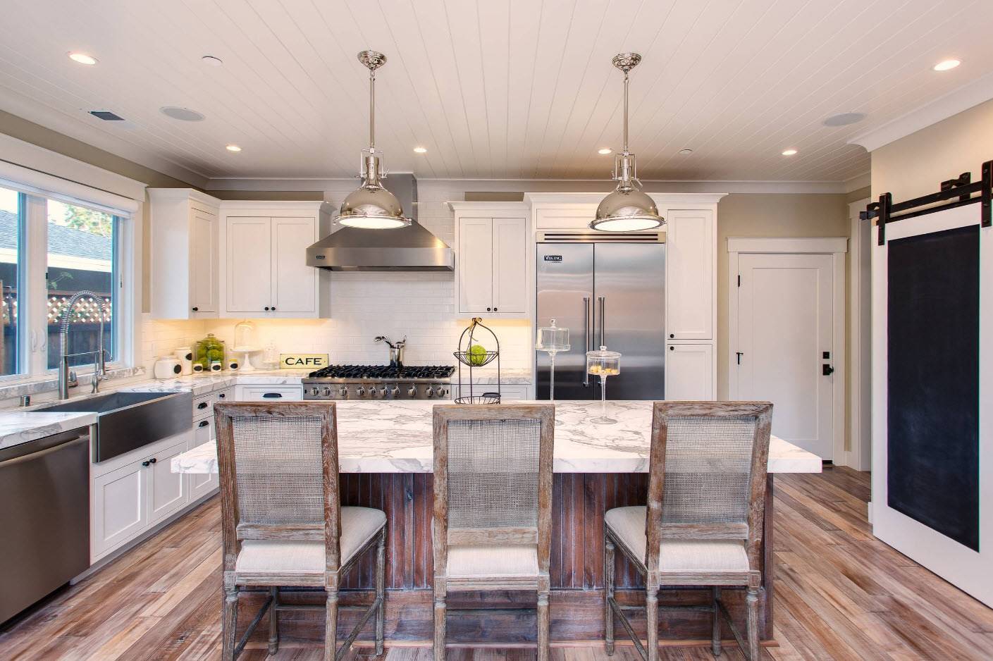 Светильники над обеденным уголком делают кухню более уютной