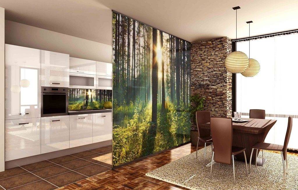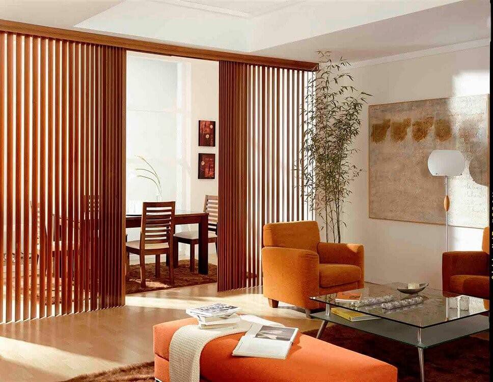 Роль разделителя между функциональными секторами могут выполнять шторы. Но, классический текстиль будет быстро пачкаться, впитывать запахи и препятствовать распространению света. Поэтому отгородить столовую или зону отдыха лучше при помощи нитяных занавесок из натуральных материалов с плотной текстурой: хлопка, бамбука, дерева. Также в качестве штор-разделителей можно использовать легкие подвески из пластика или стекляруса.