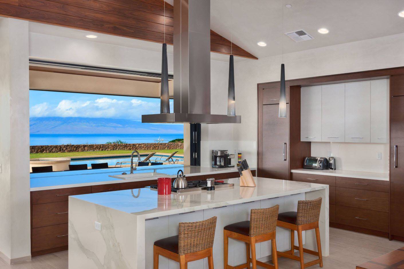 Кухня большой площади позволяет использовать в дизайне темное дерево или материалы под него. Продуманное освещение компенсирует его недостатки. Зато красота и внушительность — на виду.