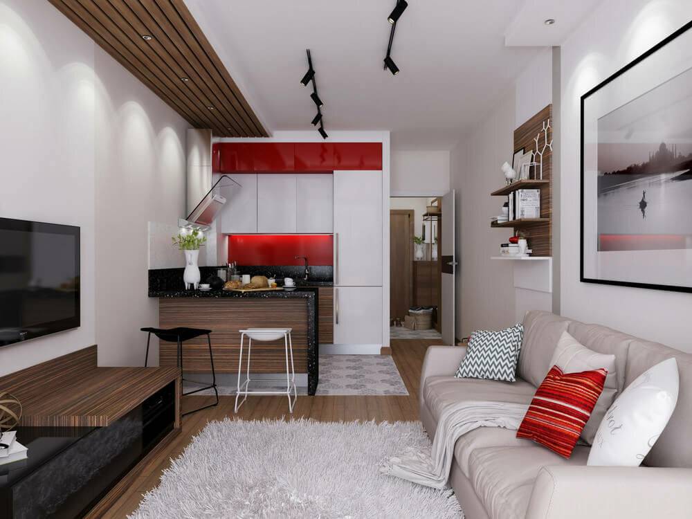 Вне зависимости от того, каким способом вы решили отделить зоны друг от друга, стоит выбирать схожие цвета и единый стиль. Вот несколько вариантов дизайна кухни-гостиной 15 кв. м с зонированием, которые можно посмотреть на фото далее.
