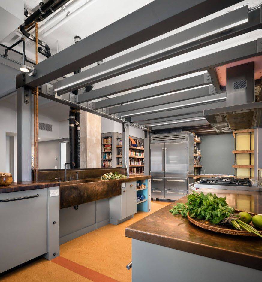 Для зонирования используются разные материалы над зоной приготовления и гостиной